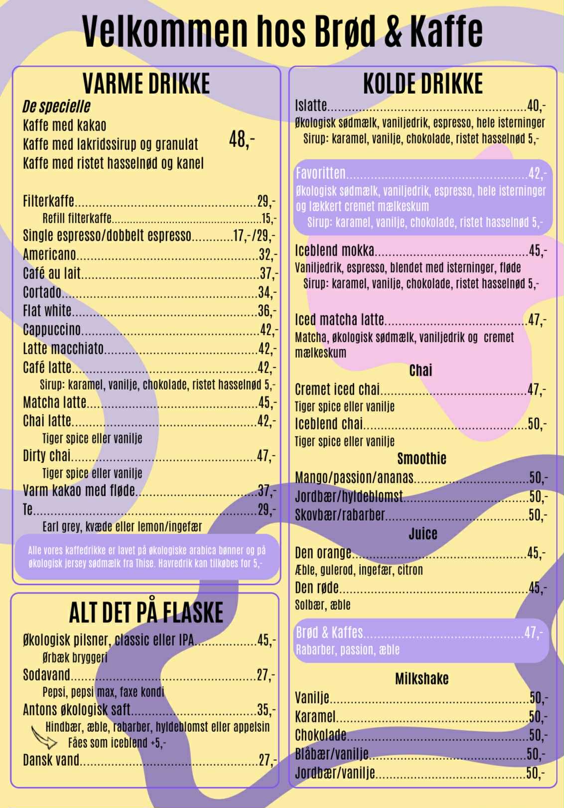 Vi har et bredt udvalg af drikke. Er du til kaffe, har vi en masse forskellige varianter, såsom cappuccino, café latte, flat white mm. Alle kaffe drikke er lavet på økologiske arabica bønner og økologisk Jersey sødmælk fra Thise. Der kan også vælge laktosefri minimælk eller havredrik i din kaffe.