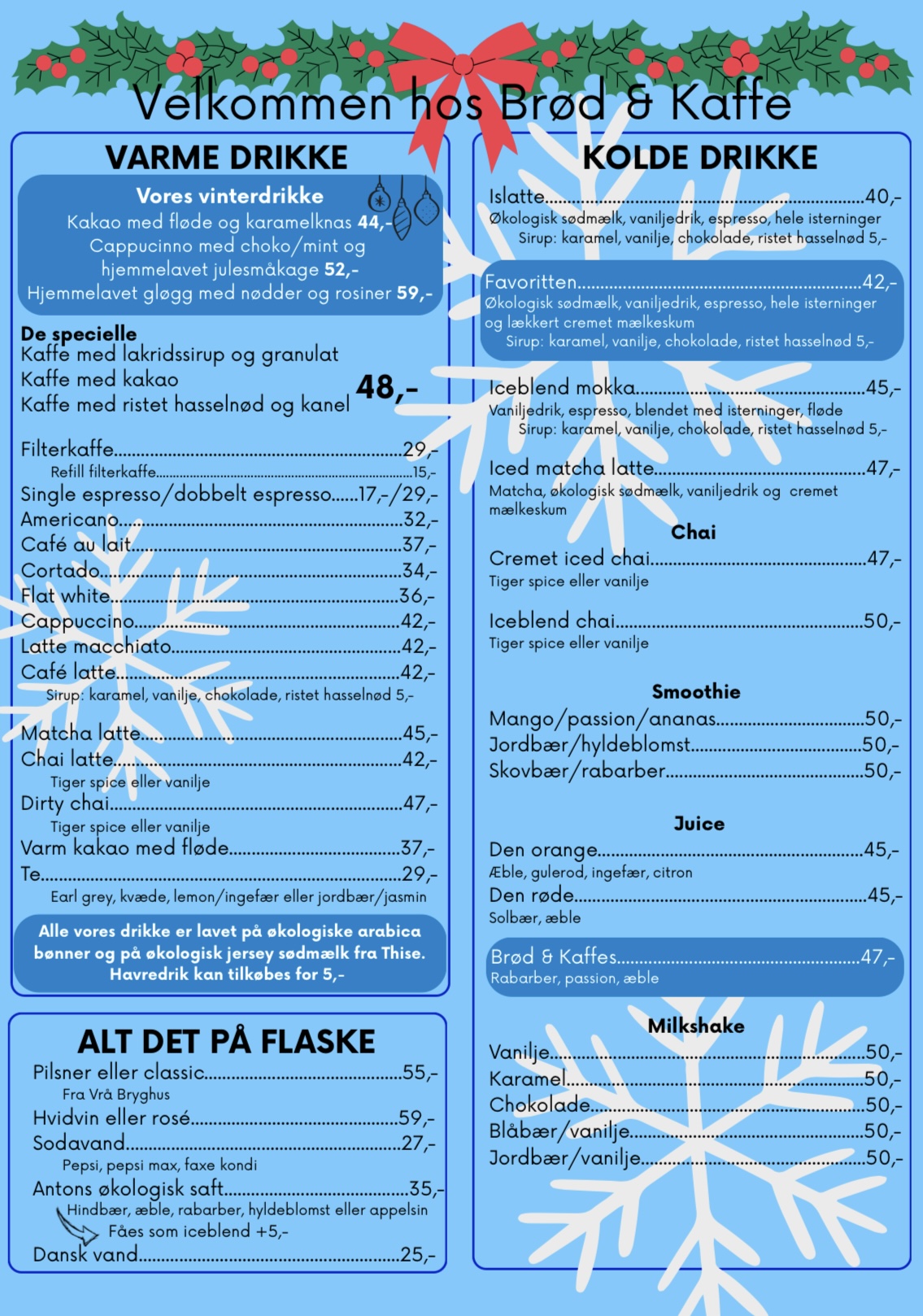 Vi har et stort bredt udvalg af drikke. Er du til kaffe, har vi en masse forskellige varianter, såsom cappuccino, café latte, flat white mm. Alle kaffe drikke er lavet på økologiske arabica bønner og økologisk Jersey sødmælk fra Thise. Der kan også vælge laktosefri minimælk eller havredrik i din kaffe.